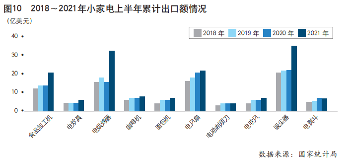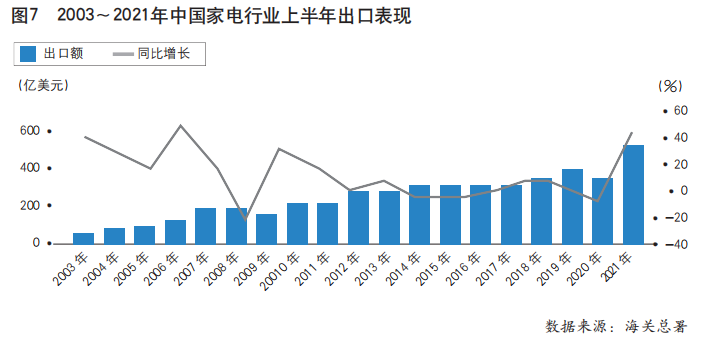 对东盟国家上半年出口额同比增长41.3%,自2020年第一季度开始一直以两位数速度增长,6月出口额同比增长19.2%。大家电、小家电和零部件上半年出口额同比分别增长42.7%、41.3%和39.5%,零部件增速加快。