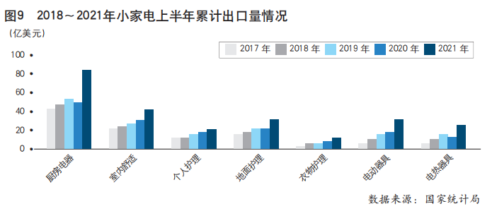 此外,微波炉出口也自2020年8月以来持续向好,2021年6月出口量、出口额同比分别增长4.8%和9.4%;洗碗机2021年上半年出口增速在各品类中持续领先,出口量、出口额同比增幅分别为54.4%和64.7%。